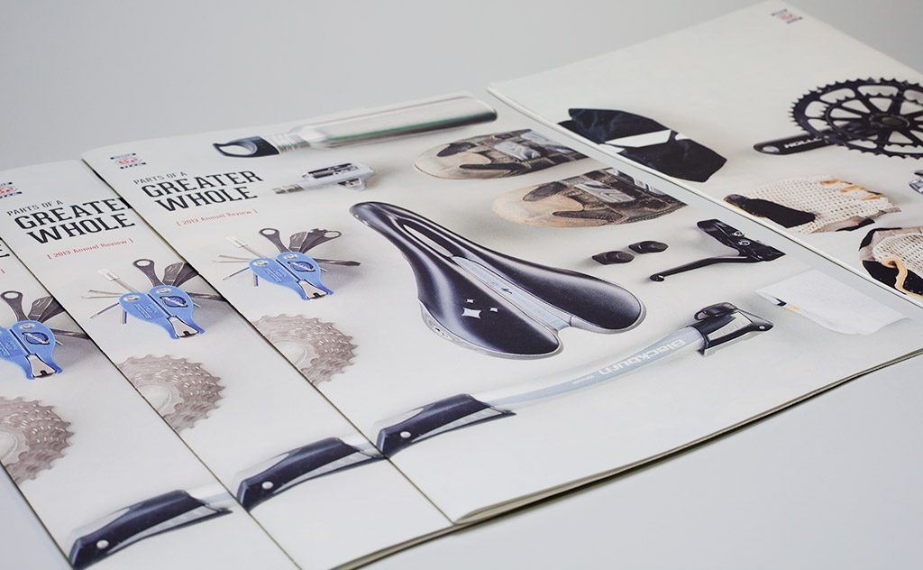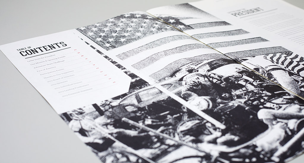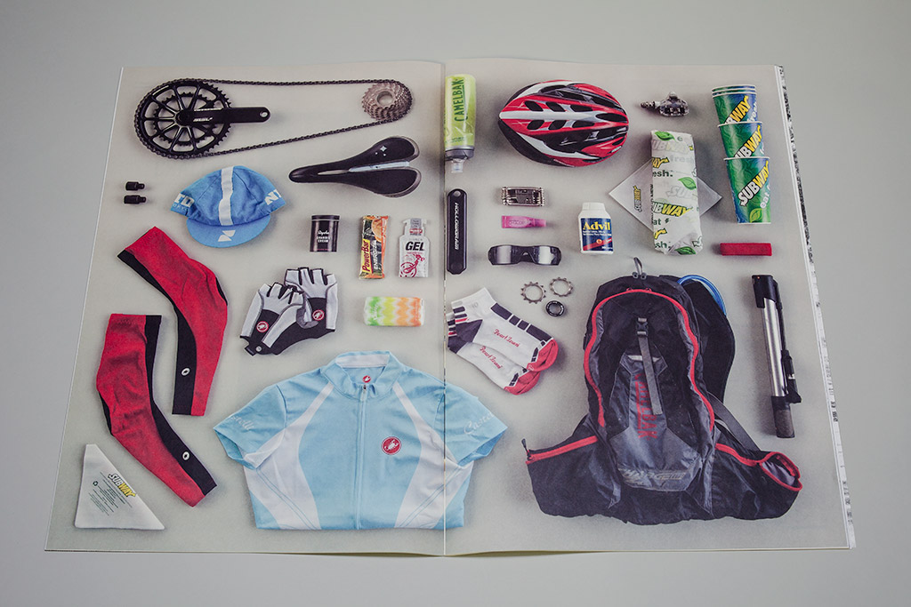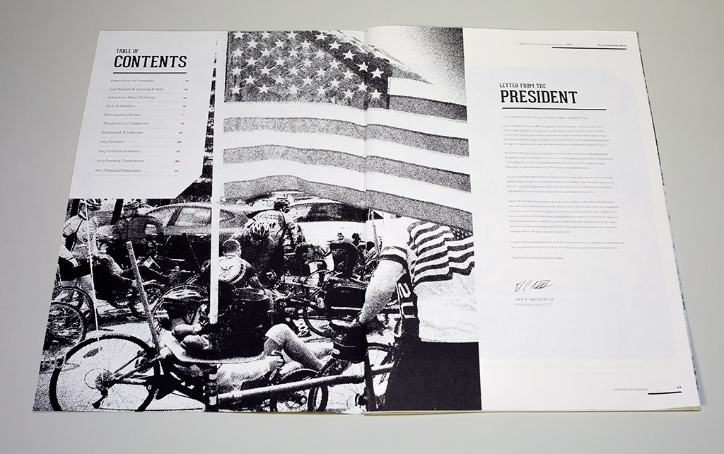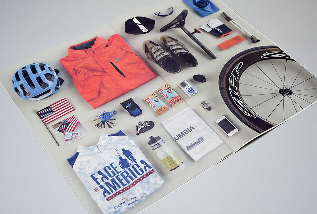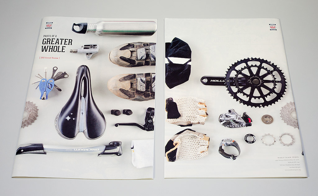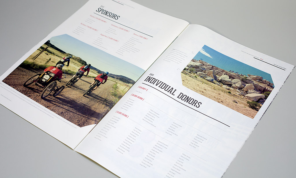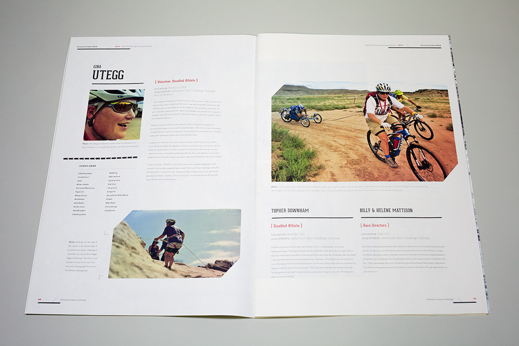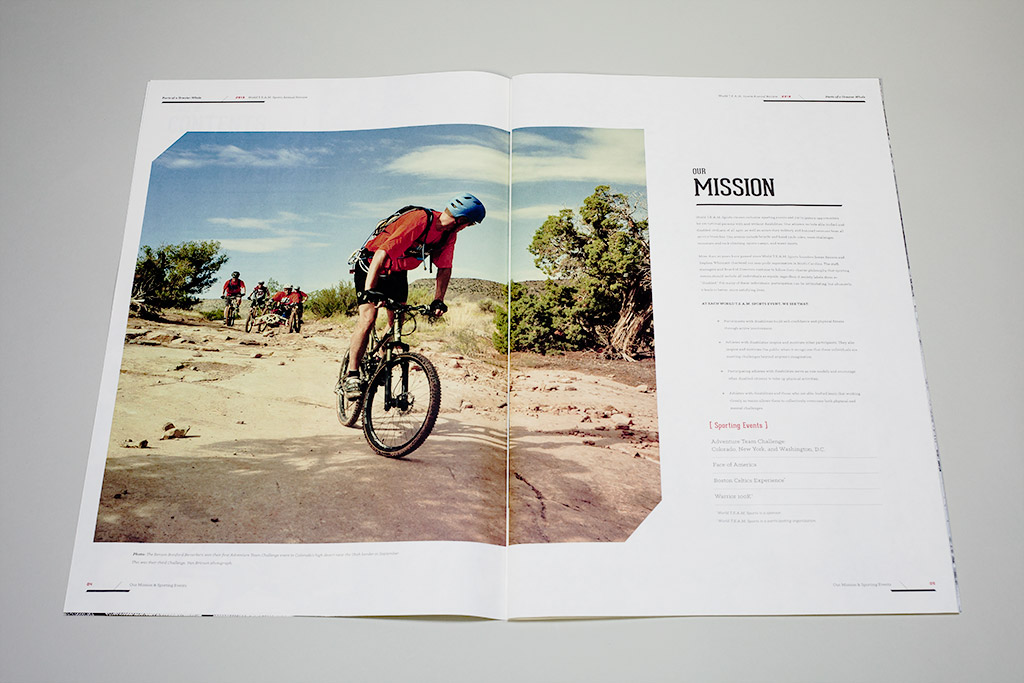 For 2013, the organization focused on expanding the definition of “Team” from beyond the participating athletes to everyone involved in making the sporting events possible. Volunteers, fundraisers, board members, spectators, and sponsors all play a part in the greater whole. We interviewed individual members of the organization and shared their personal stories of growth and change from participating. Introducing each of the stories is a photographic spread of items the individual carried with them during their experience. The arrangement of sporting gear, gloves, sunglasses, apparel, buttons, flags and water canteens reinforces the theme of separate pieces each having an important role in achieving the greater vision.